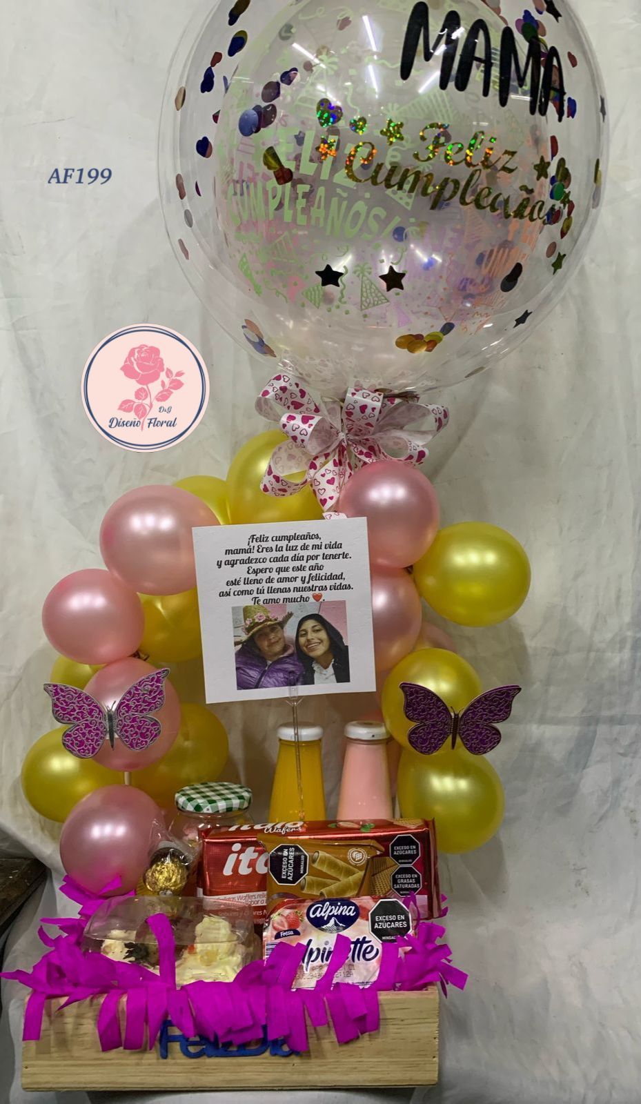 Ancheta dulcera con postre, alpinette, piazza, ferrero x 3, jugo de naranja, galletas italo, frasco de gomas, yogurt, globo y tarjeta personaliza y decoración.