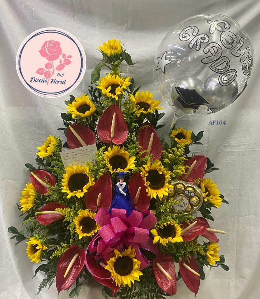 Diseño floral x 16 girasoles, 14 anturios, muñeca porcelanicron, chocolates ferrero y globo burbuja personalizado.