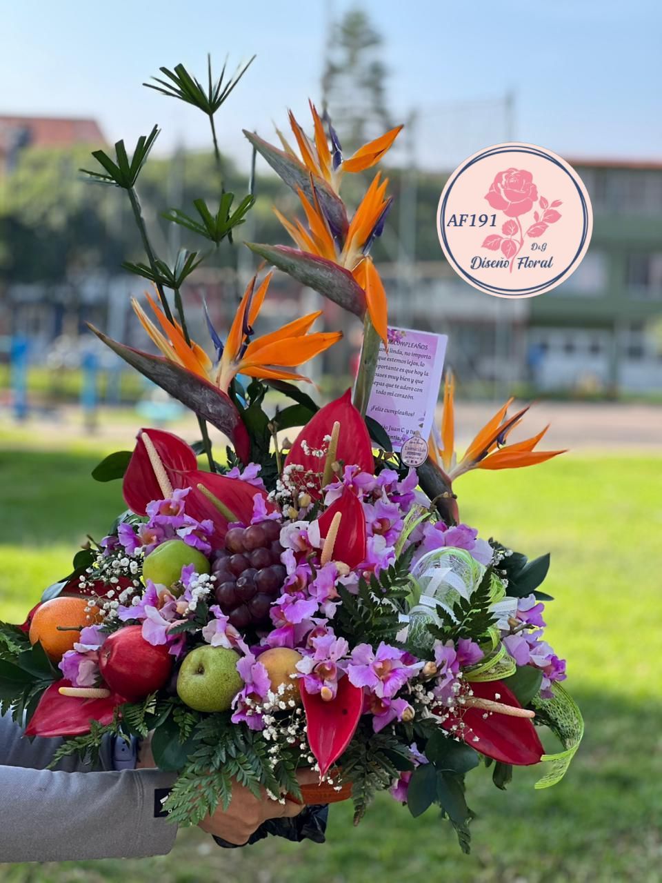 Arreglo frutal flores exóticas orquídeas, aves del paraíso, anturios, sombrillas.