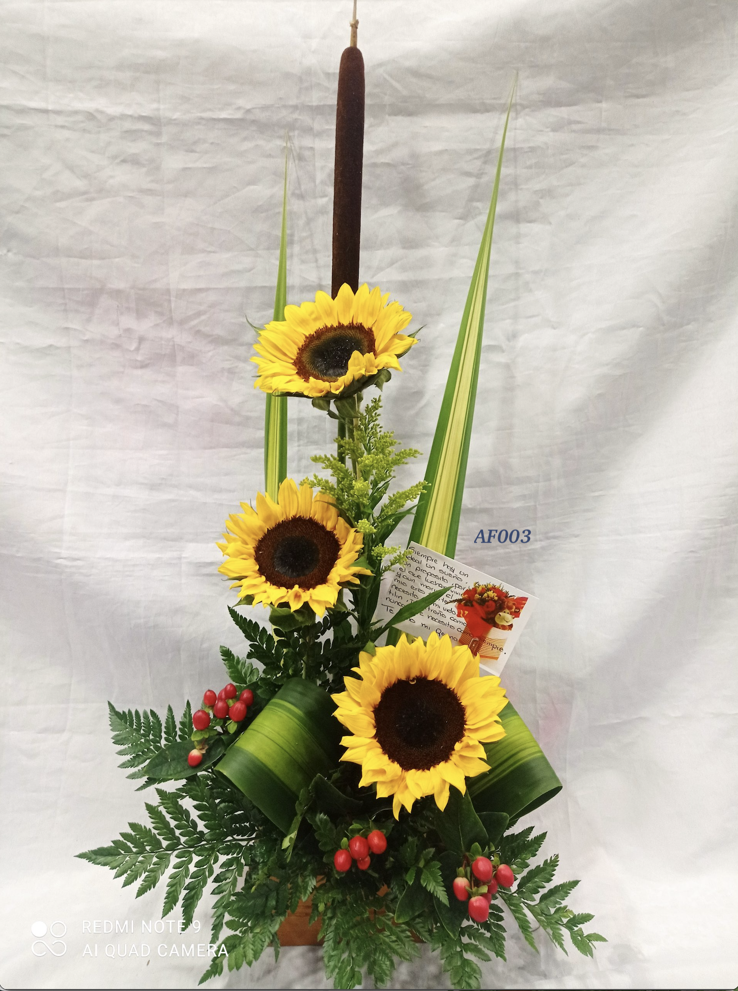 - 3 Girasoles Vibrantes: Representando la energía positiva y la luz del sol, los girasoles añaden un toque de alegría y vitalidad al arreglo.