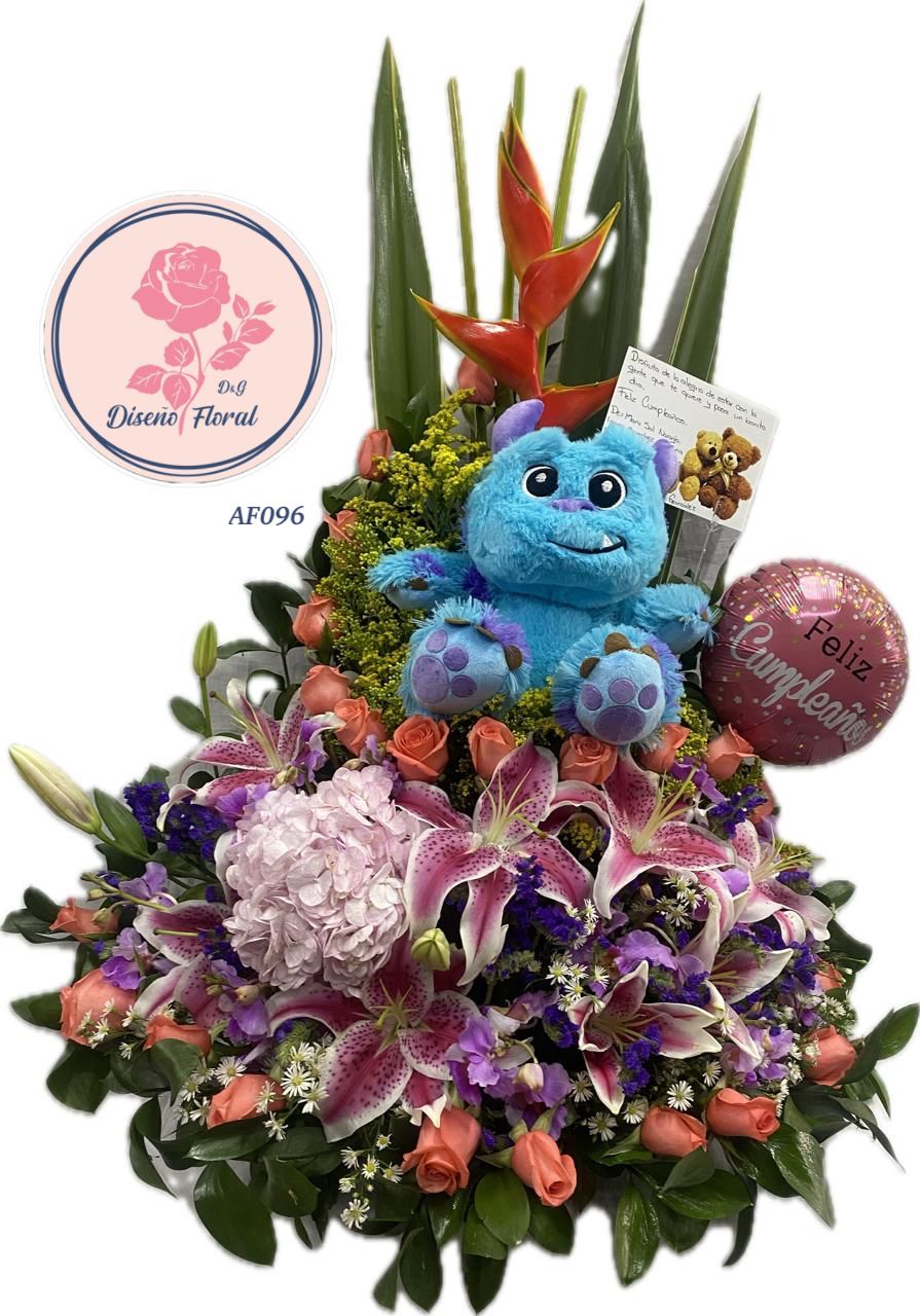 Para añadir un toque de ternura, incluimos un adorable peluche y un colorido globo que elevan este diseño a una experiencia completa. Cada elemento ha sido seleccionado con precisión para crear una sinfonía floral que transmite emociones y crea un impacto visual.