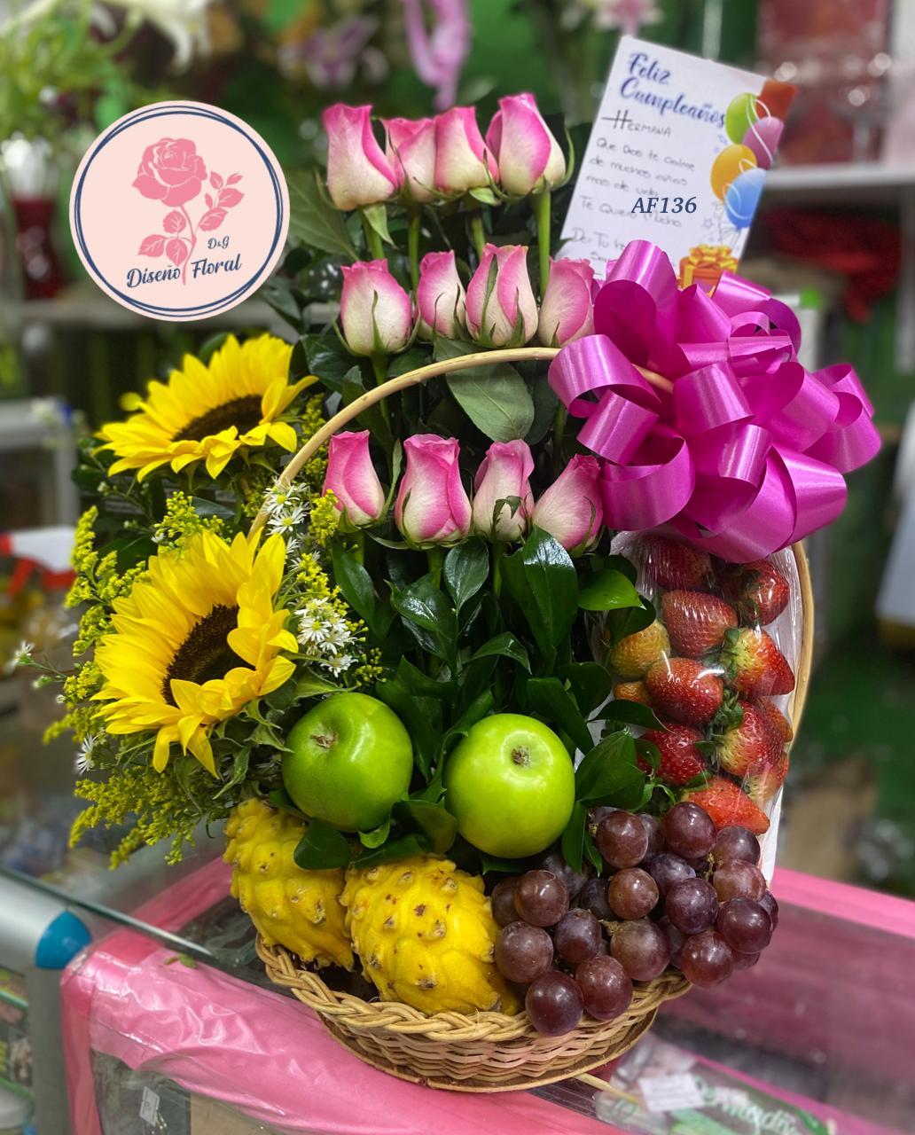 Te invitamos a descubrir la armonía perfecta entre lo fresco y lo hermoso con nuestras exquisitas canastas frutales adornadas con rosas y girasoles.